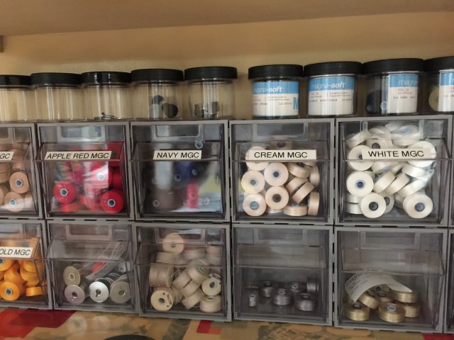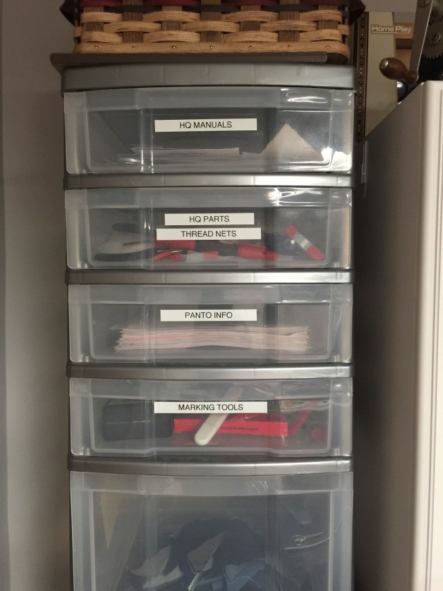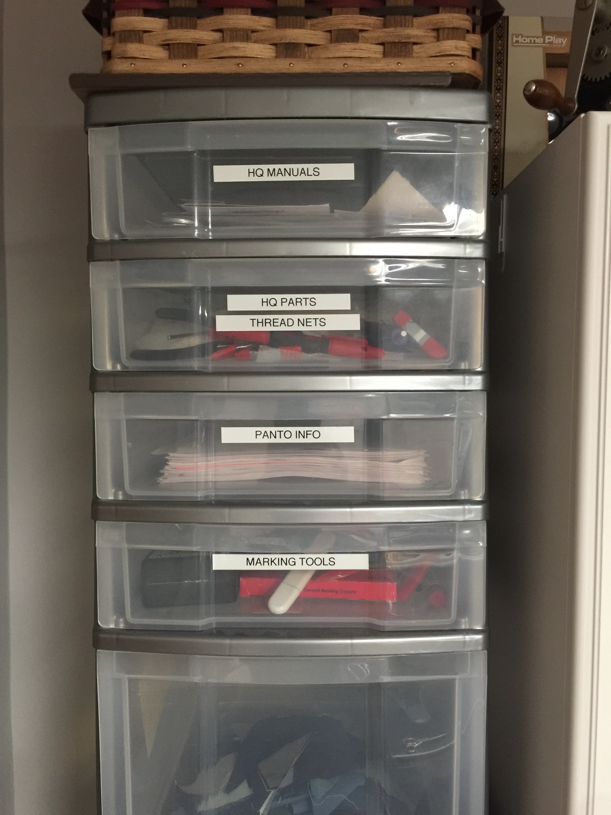 Hubby found these little organizer drawers from Menards and they are perfect for long arm bobbins.