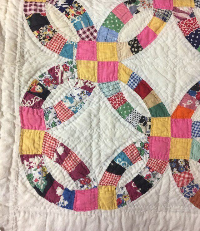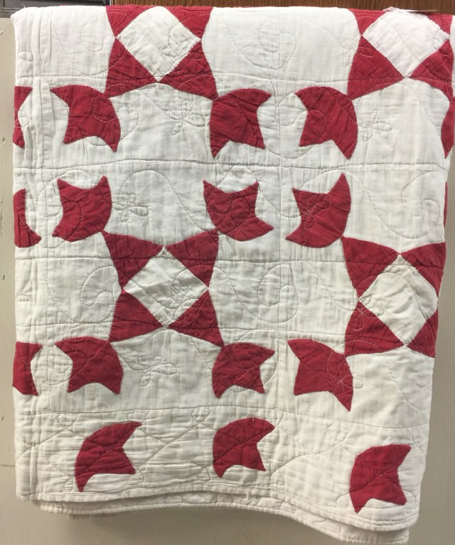 Thanks for sharing those beautiful gems. I’ve seen a few other early machine quilted quilts, and one year, Mr. Nolting brought his antique quilt machine collection to MQS – fascinating! The first longarm I ever saw, the machine was stationary and the frame moved back and forth on a hanging mechanism from the ceiling! And that wasn’t all THAT long ago. LOL All that to say I wonder if the lady who did this one was a disgrace in her neighborhood because she machine quilted!