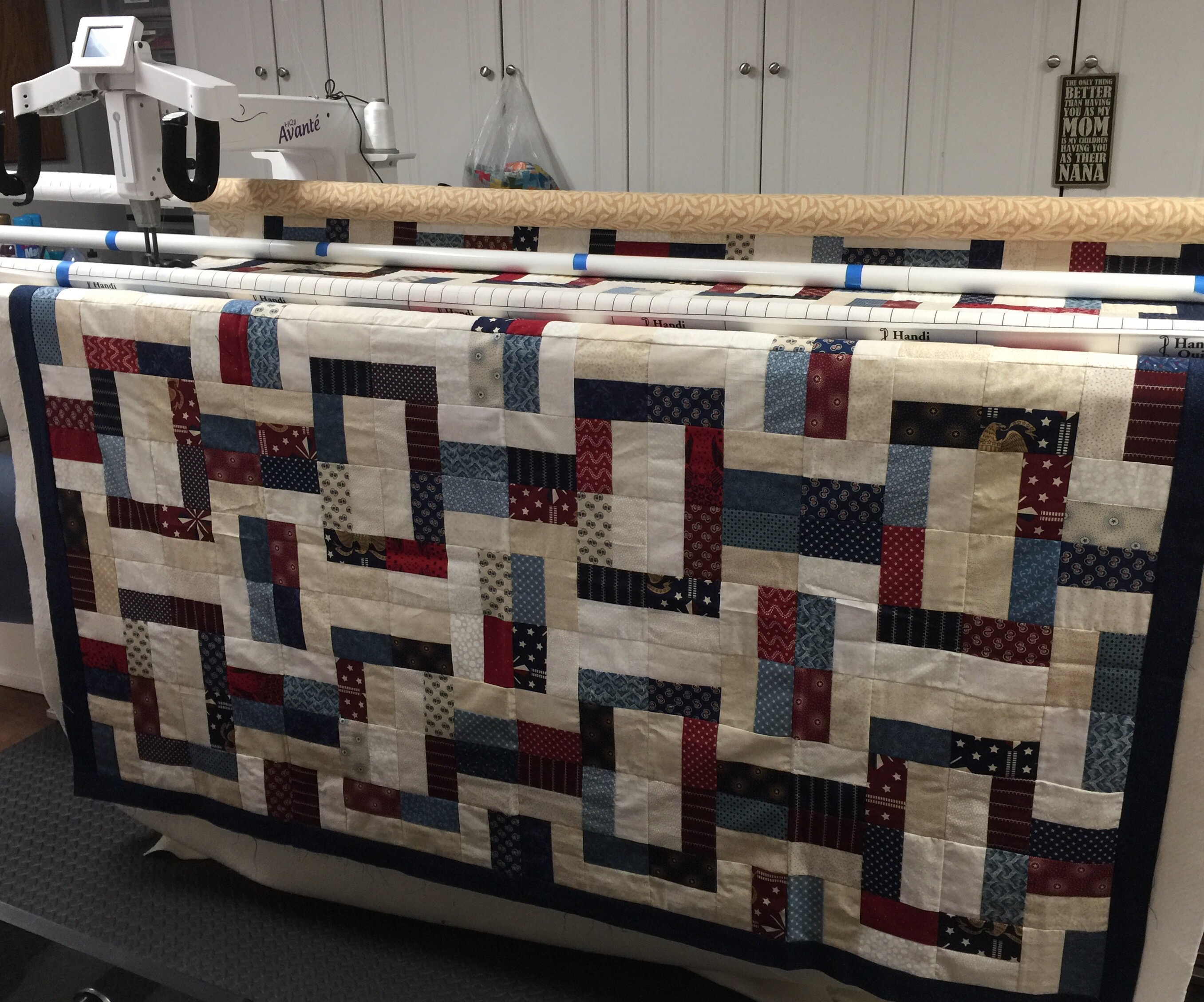 That sure is a pretty quilt. I love all the low value fabrics – they really do their job well to highlight the reds and blues, yet add a little something, something to the overall effect. Of course, your quilting is spot on and perfect for the design. ~smile~ Roseanne
