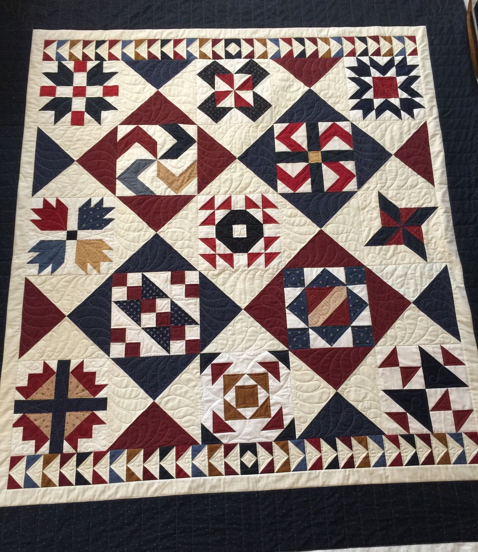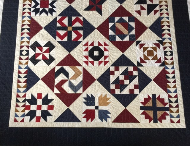 The last of the QOVs from the Stitching Sisters group is done for this month. This beautiful sampler was pieced by Cheryl B. It is quite large and I had a hard time getting pictures!