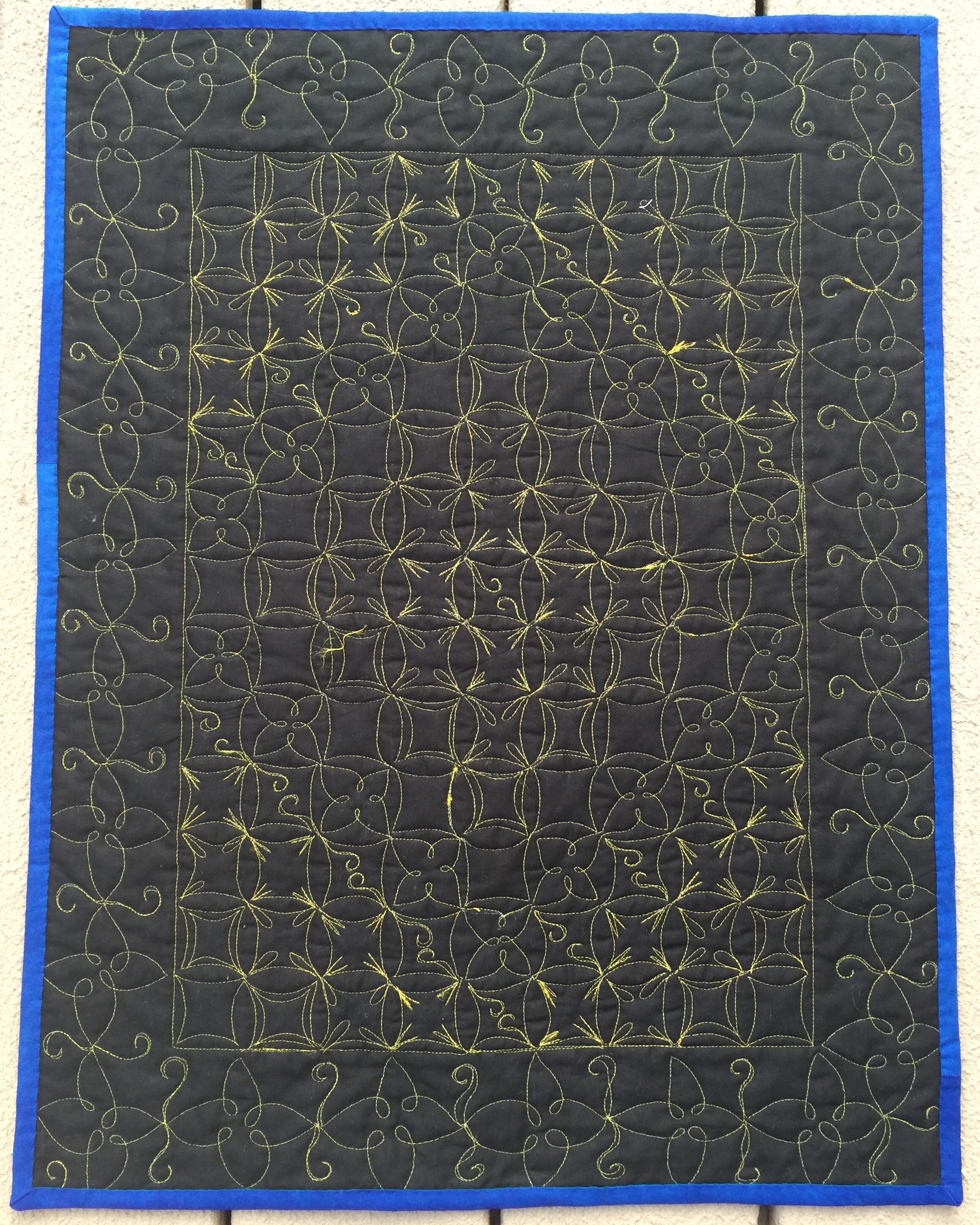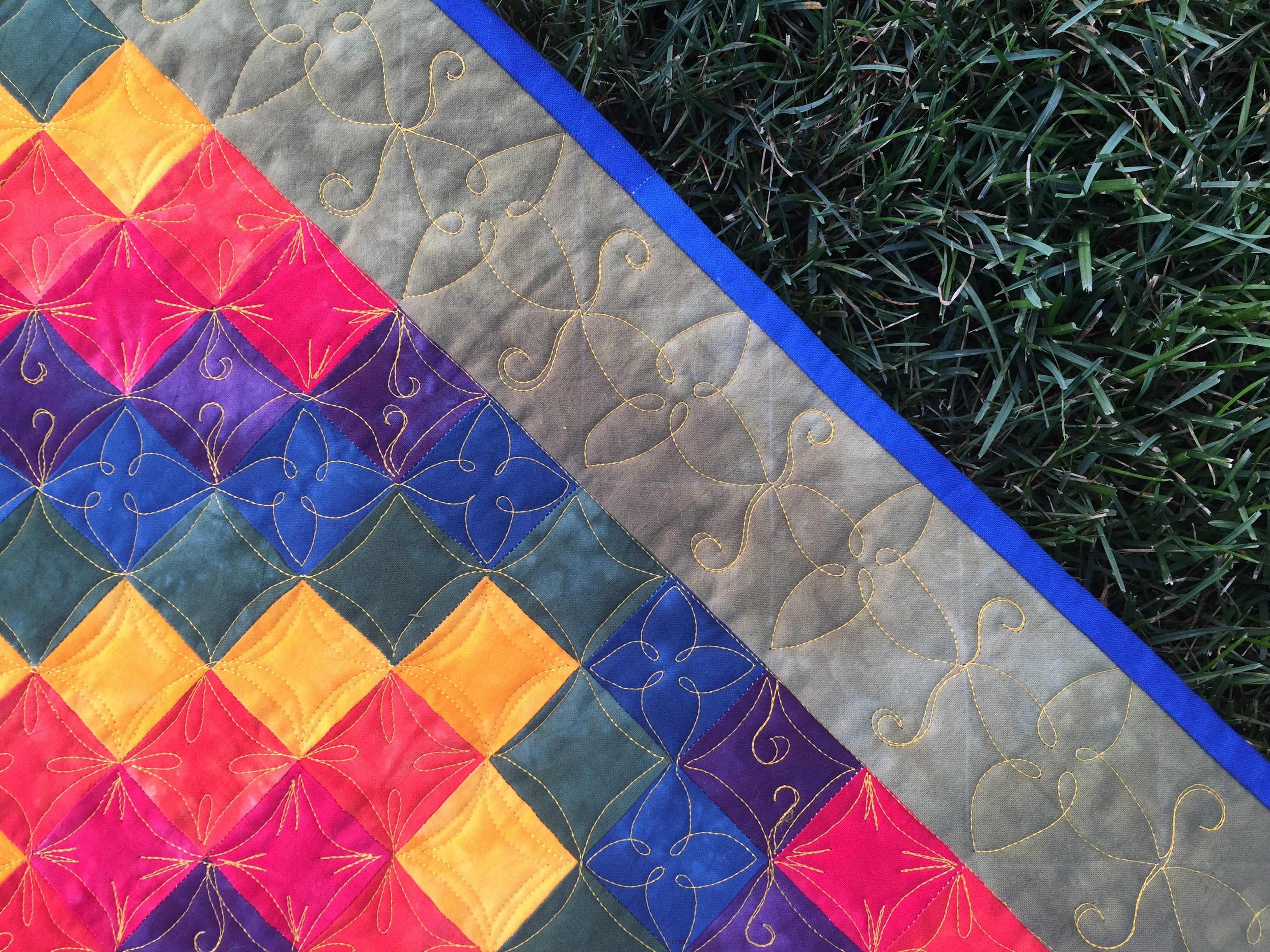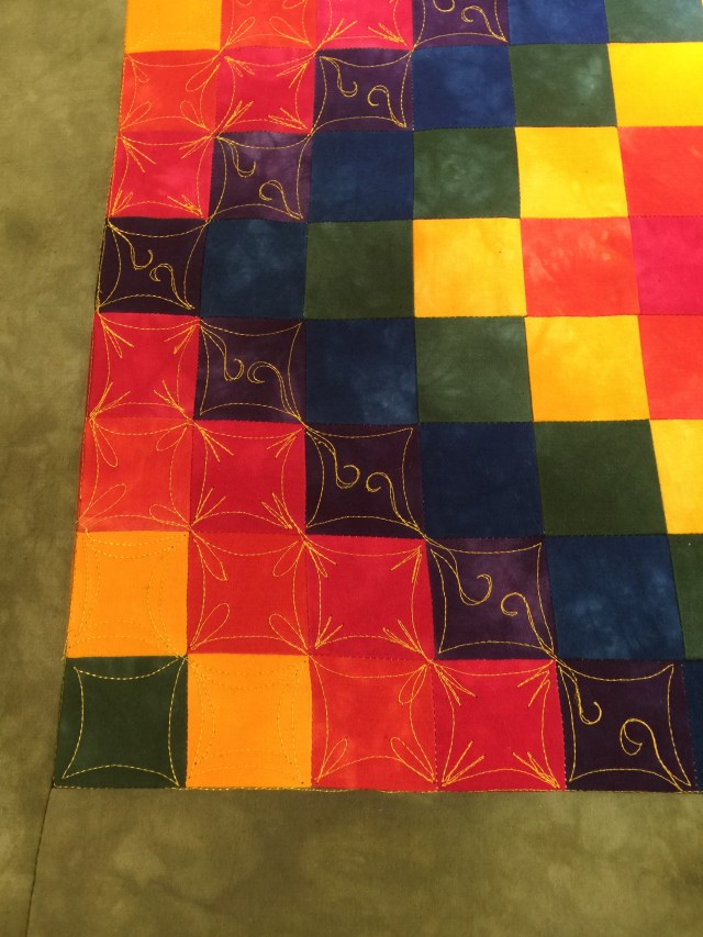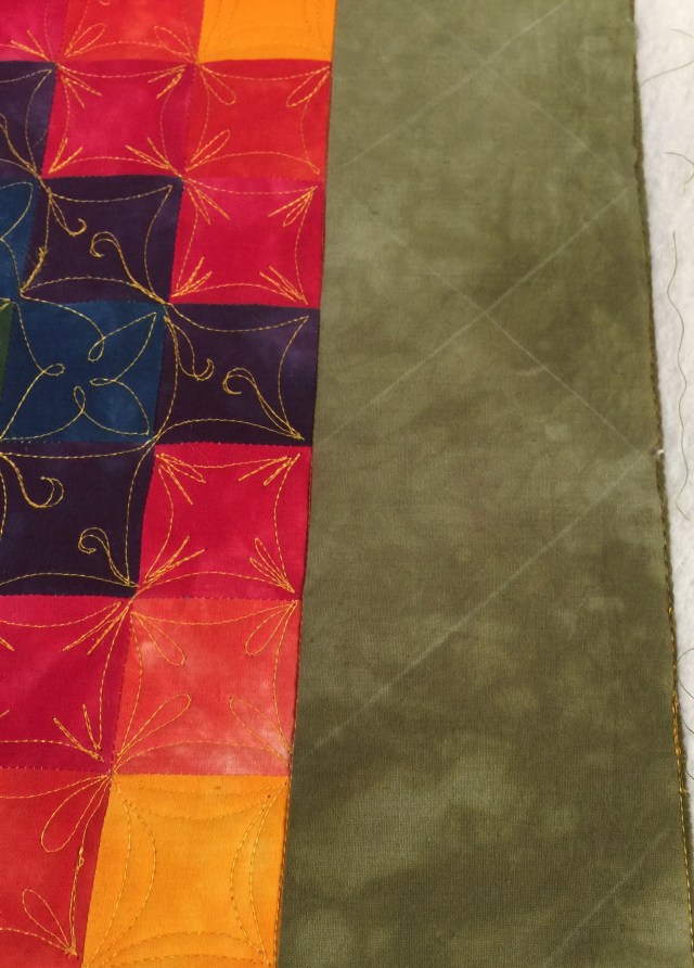 If I hadn’t had some issues with thread shredding, I could have quilted the entire center section with only one start and stop! I marked a diagonal grid on the border and used one of the designs from the center to quilt that.