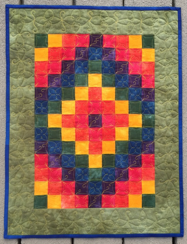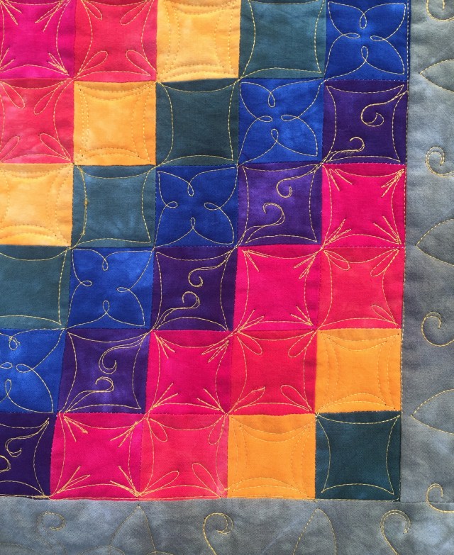 The different quilting designs look great together. It’s a simple quilt that takes on a new dimension with the variety of shapes. The curlicue on the purple reminds me of the swirls you used on the star block last week. I really like that and will have to give it a try. Thanks for the opportunity to win the book.