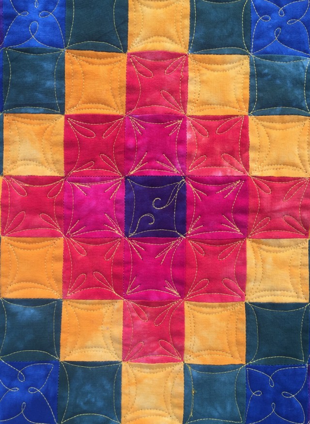 I like the variety of designs used on your piece. I think this will be just the type of work to explore on my hand dyed fabrics. Did you print out several of the pages to work out your design? Or did you use a sheet protector and dry erase markers, then your camera to remember what you did? With so many designs, I think I might get lost as I tried to remember how I drew them out. Any tips on ‘keeping my place’ would be appreciated.