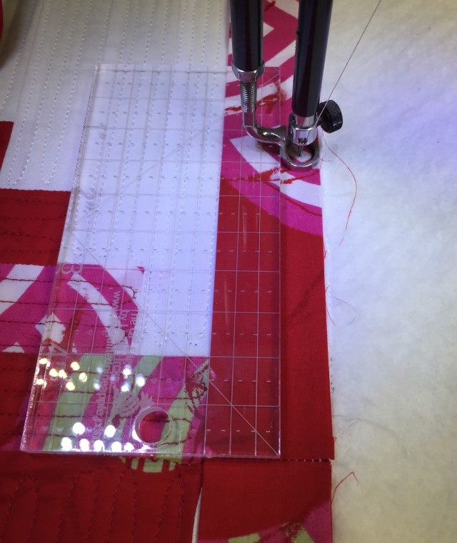 I placed the binding with the cut edge lined up with the edge of the quilt. The edge of the foot on my long arm is one quarter inch from the needle so I line the edge of the foot up with the cut edge of the binding. I started out using a ruler to keep the seam line straight.