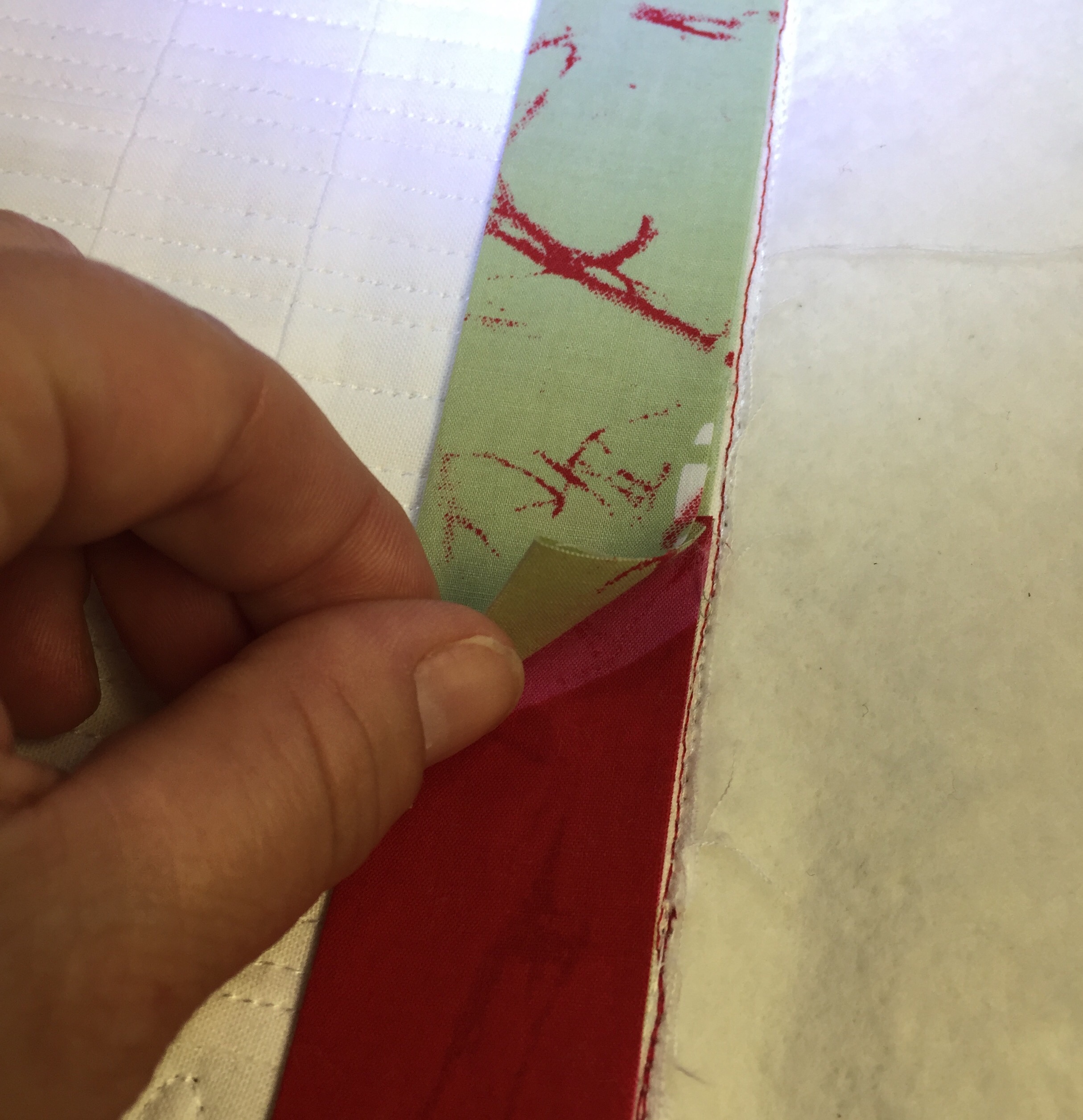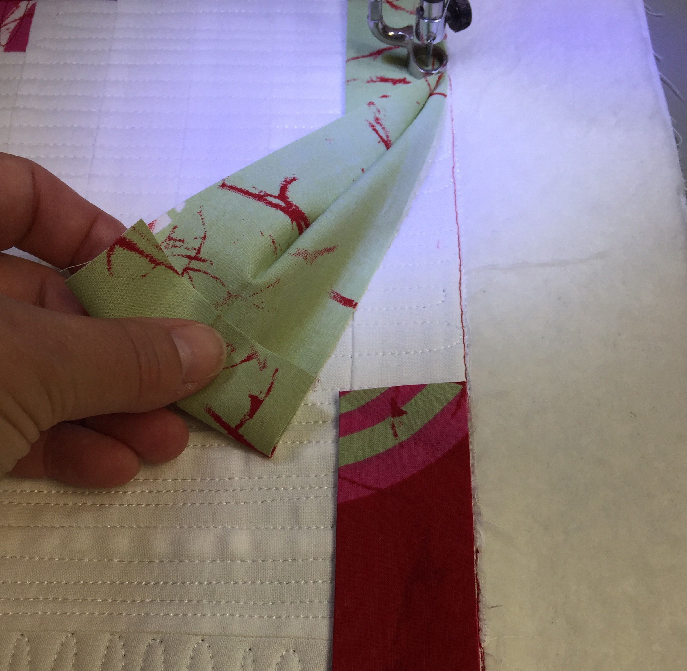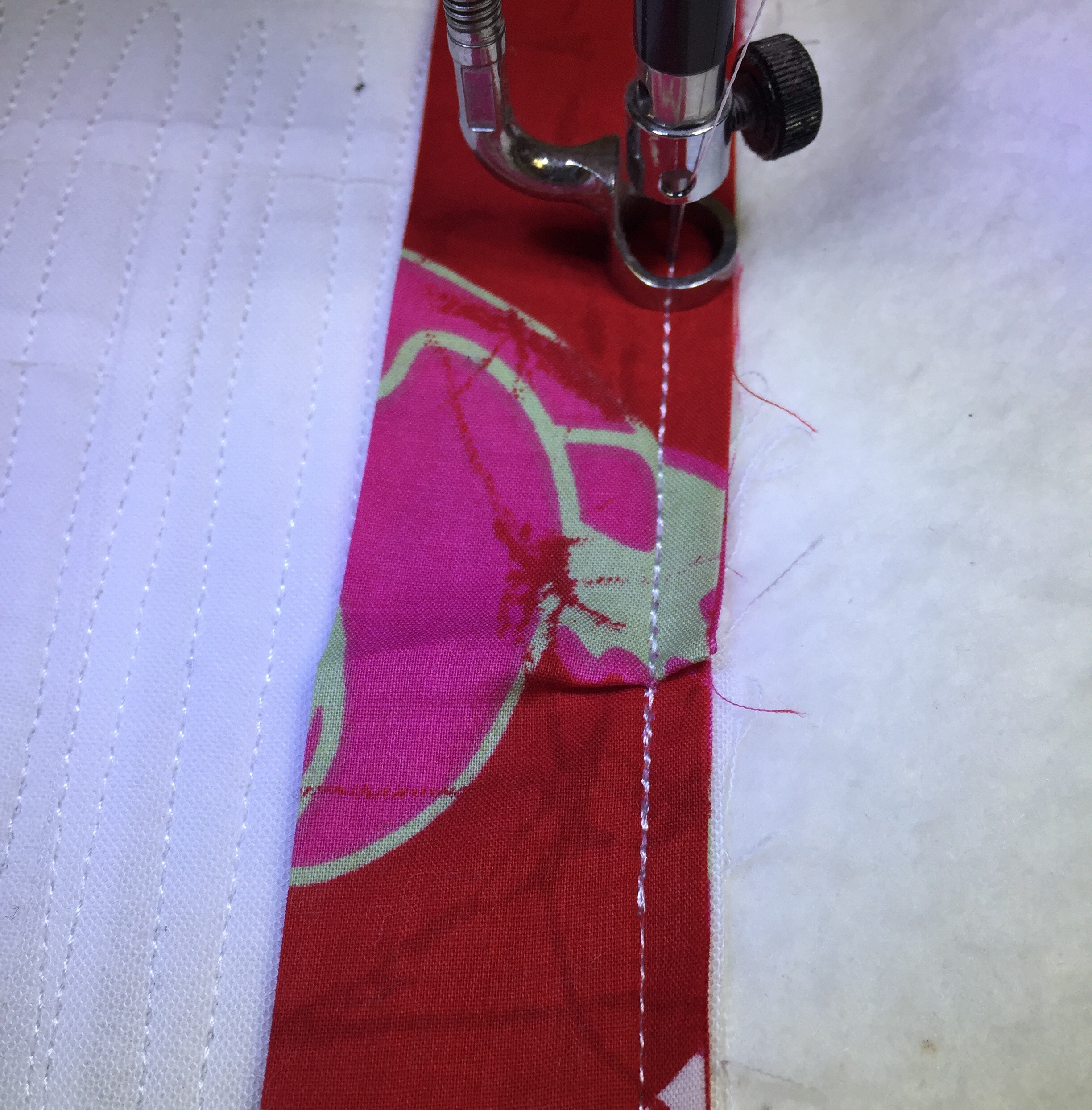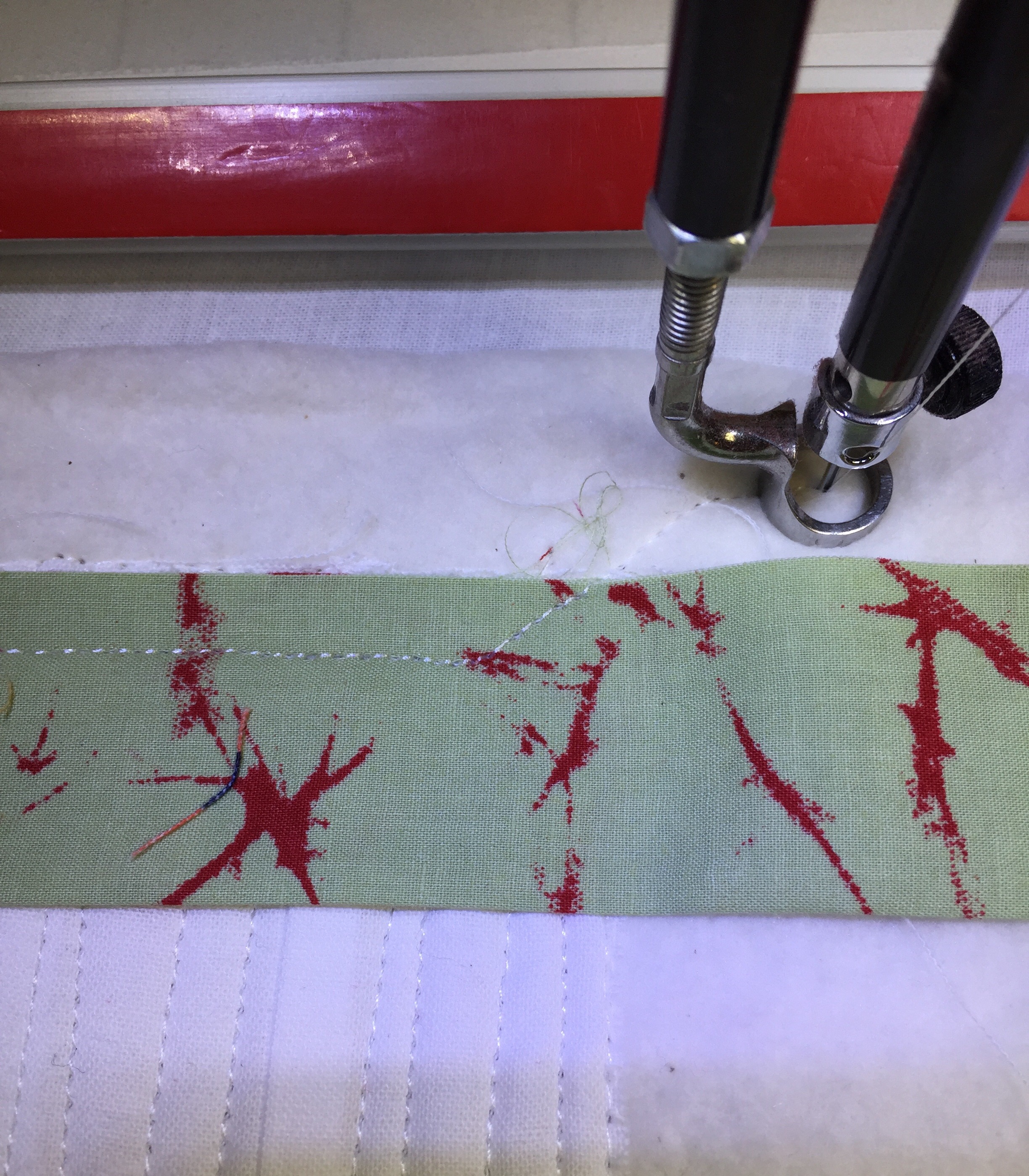 I placed the binding with the cut edge lined up with the edge of the quilt. The edge of the foot on my long arm is one quarter inch from the needle so I line the edge of the foot up with the cut edge of the binding. I started out using a ruler to keep the seam line straight.