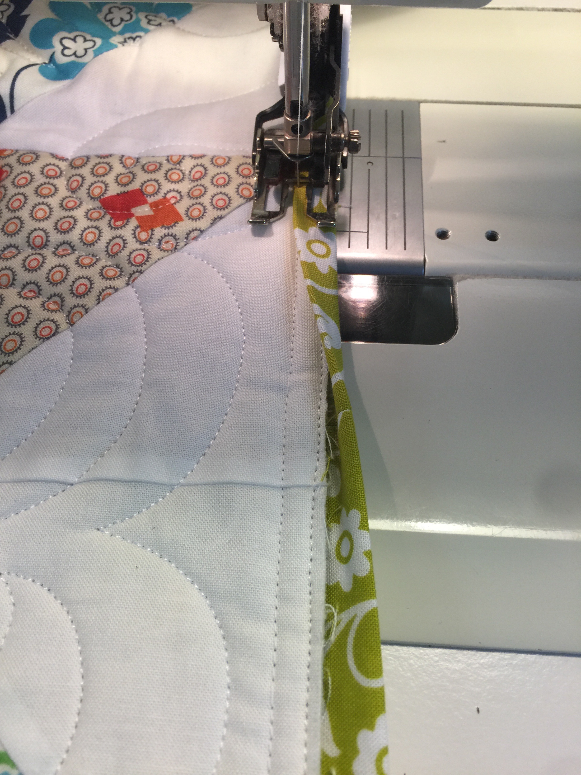 Mr. Wonderful are on our way to see his mom today! Before I left, I was able to finish this quilt. For time’s sake, I did all the binding by machine. I started by stitching thebibding to the back of the quilt and then pressing the binding away from the quilt.