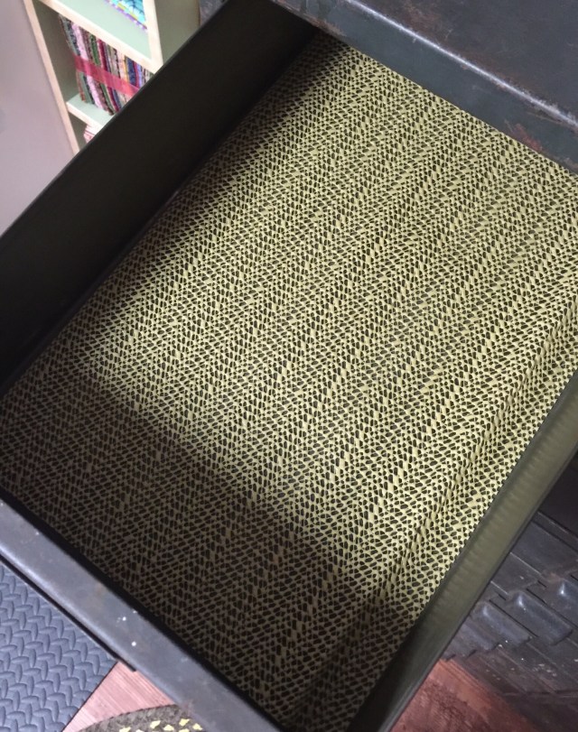 I have very fond memories of tinkering with my dad in his workshop. He even made me my own workbench and gave me some tools of my own. Believe it or not, I spent a lot of time scrubbing this up before I brought it into my sewing room! But I don’t really mind the rusty bits. My dad could often see value in things that others could not see. He loved his tools and was a master at fixing and making things. I picked up some shelf liner for the drawers at the dollar store.