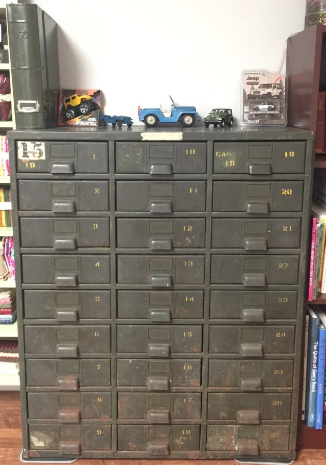 Ah, my hubby would love this cabinet. Our garage/shop is stuffed with the bits and pieces of hardware and miscellaneous stuff he has accumulated over the years! And if I ask him to build some little sewing accessory he can usually find just the pieces he needs to do it. Not so unlike us quilters with our stashes of fabric and supplies I’d say!