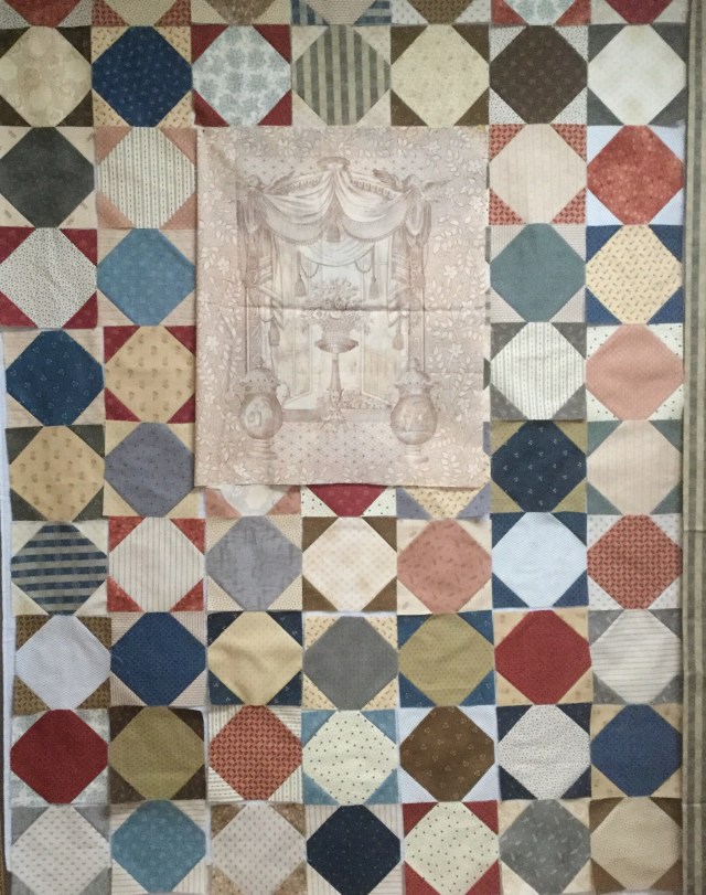 This panel has the Declaration of Independence on it. The fabric on the right will be the border. Hmmmm… I think I like this!