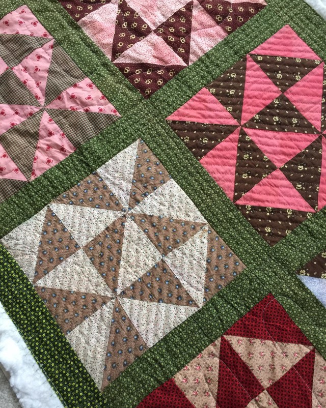 I like it when you can see the quilting design on the back. With patterned fabrics on the front of a quilt, it is sometimes hard to get the overall view of the design.