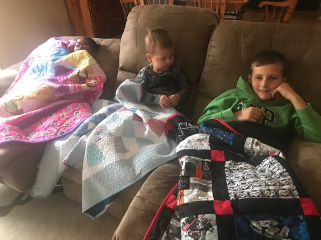 Aren’t the quilts AND the children cute? I bet the fleece makes those quilts SO warm!