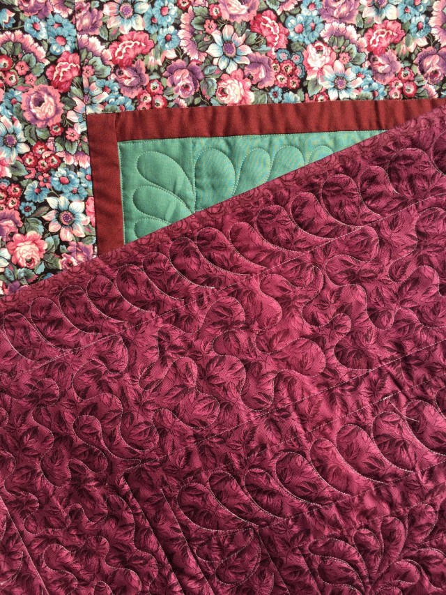 She wanted me to not only quilt it, but also add the binding and a sleeve to the back, but she didn’t have any extra fabric. Can you believe I found in my stash two of the exact fabrics used in the top and backing?