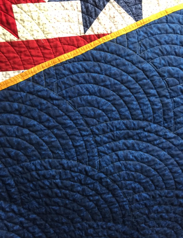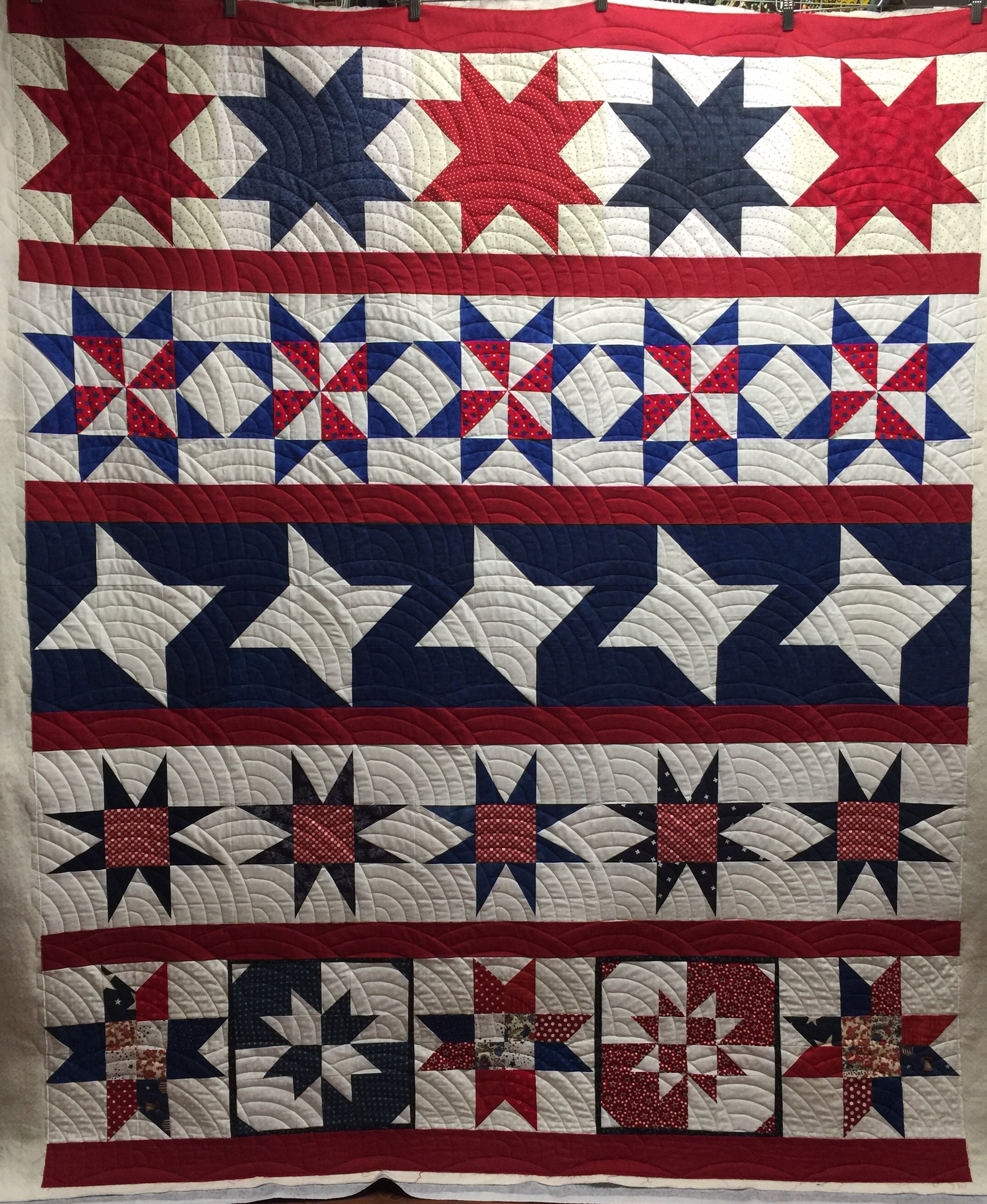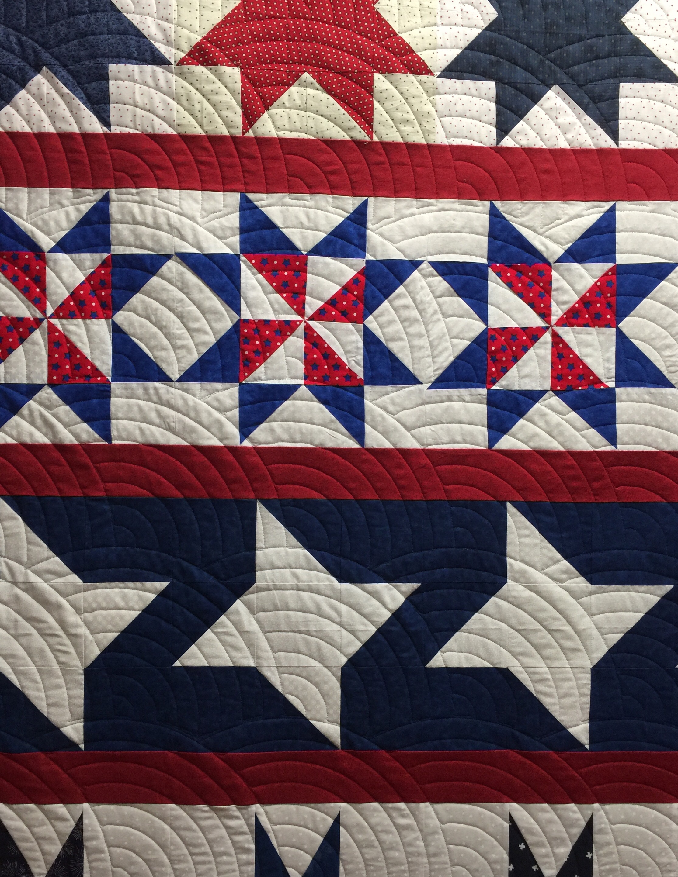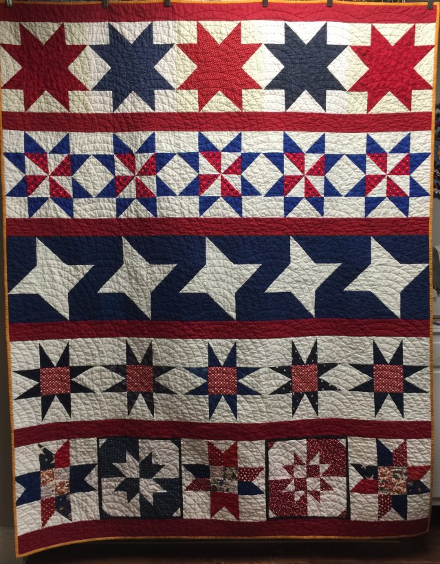 Katy I love the baptist fan! Do you do that free motion? Thank you very much for completing this quilt. This was one of Stitching Sisters group row quilts. Will definitely be presented this month and I will share pictures of the proud Veteran and his/her quilt.