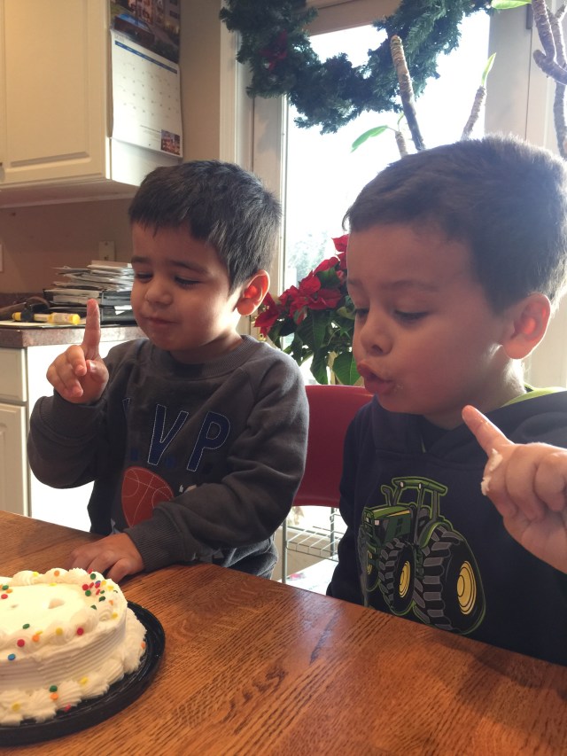 Little E turned two this week. We had dinner and a small cake for him. Big brother showed him how to get the good stuff!