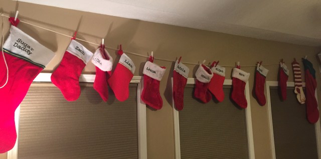 That is too funny on the birthday boy! LOL How lovely to have so many stockings. They all come to your house at Christmas?