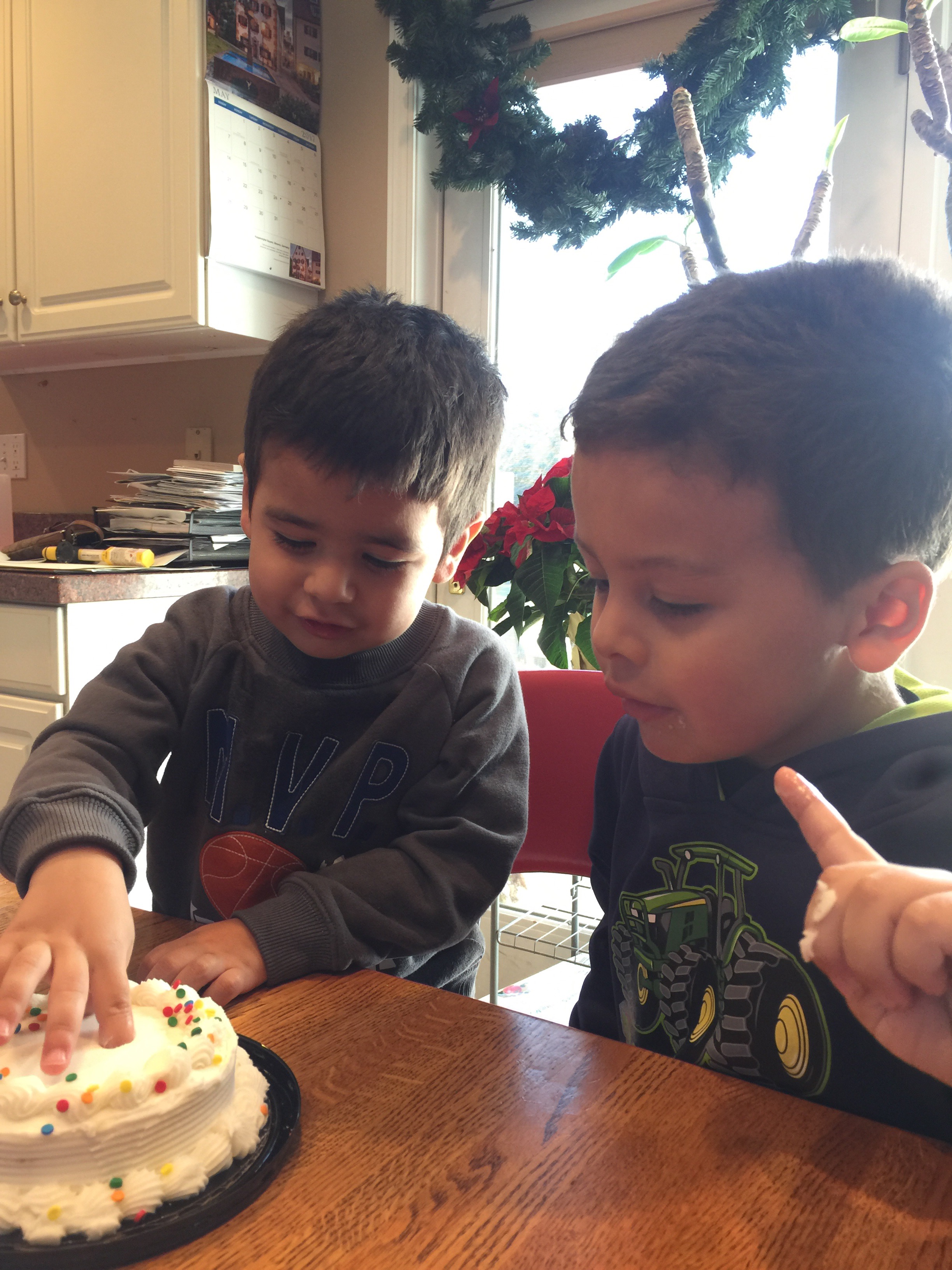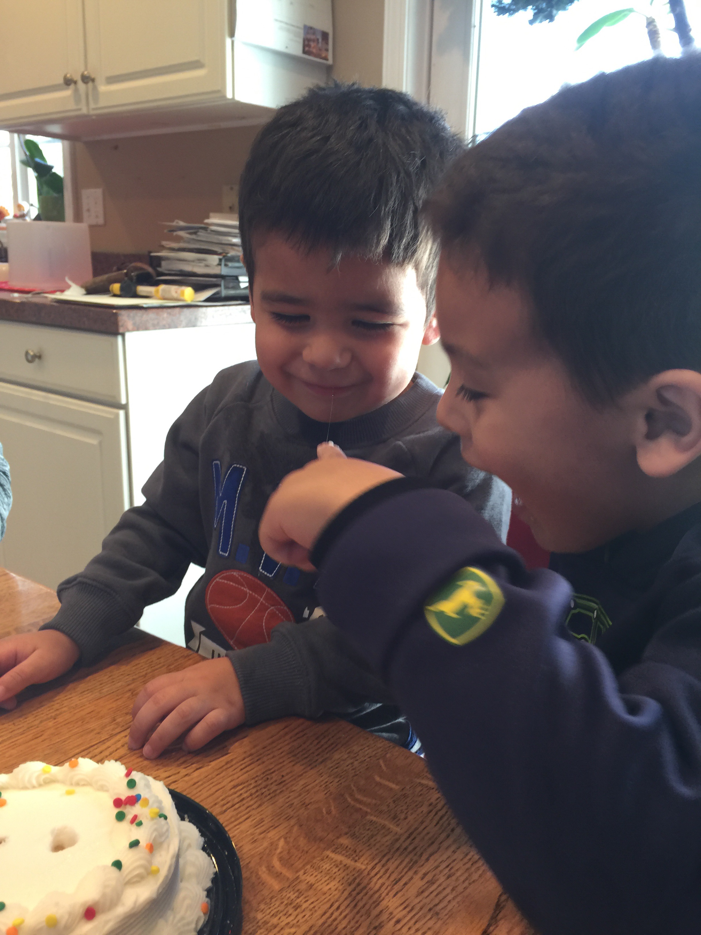 Little E turned two this week. We had dinner and a small cake for him. Big brother showed him how to get the good stuff!