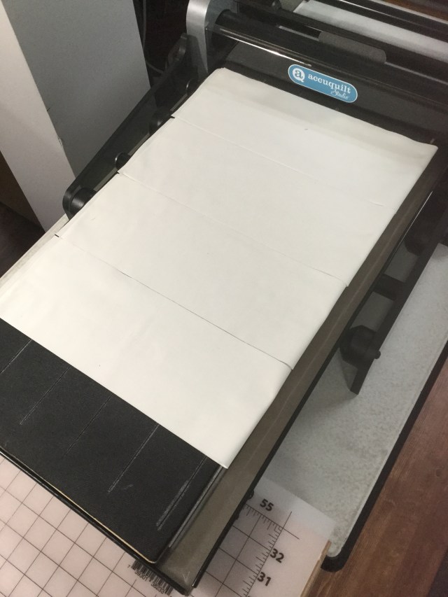I’m going to cut 2 1/2 inch by 5 inch rectangles from both the charm pack and the back ground fabric. I love my die cutter and use it whenever I can, but I don’t have a die this size and shape. No worries. I cut 5 inch strips and placed them on my 2 1/2 inch strip cutter die like this.