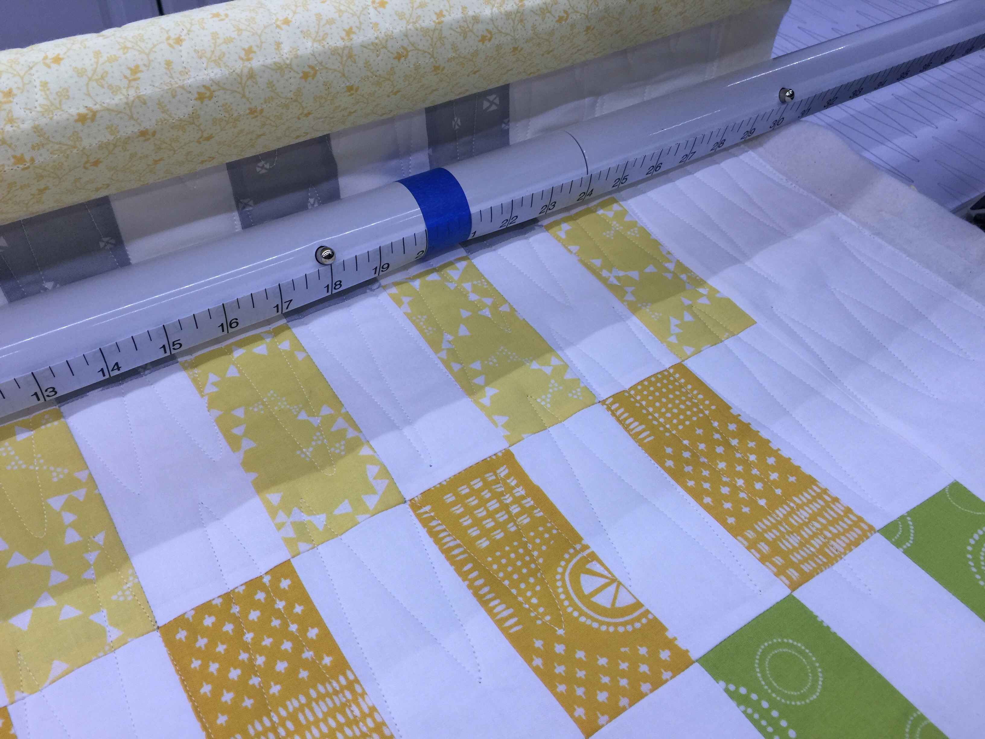 I really like the design of that pantograph, Katy. Let’s face it – I like them ALL. LOL! I didn’t realize you suffer from carpal tunnel. (All the more reason to have an Accquilt cutter.) I have CT as well. It was so bad when I was working, it forced me into retirement. It’s a lot better now but there are times I have to wear my braces. I just love the colors in this particular baby quilt. Looking forward to seeing it finished tomorrow.