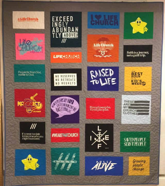 I mentioned before that I had a secret project I was working on. Now that this quilt has been gifted, I can share it with you. My pastor’s wife asked me to make this for our pastor. Our church uses t shirts to identify our volunteers to our visitors. She brought over one of each T-shirt we have used over the last five years we’ve been in existence.