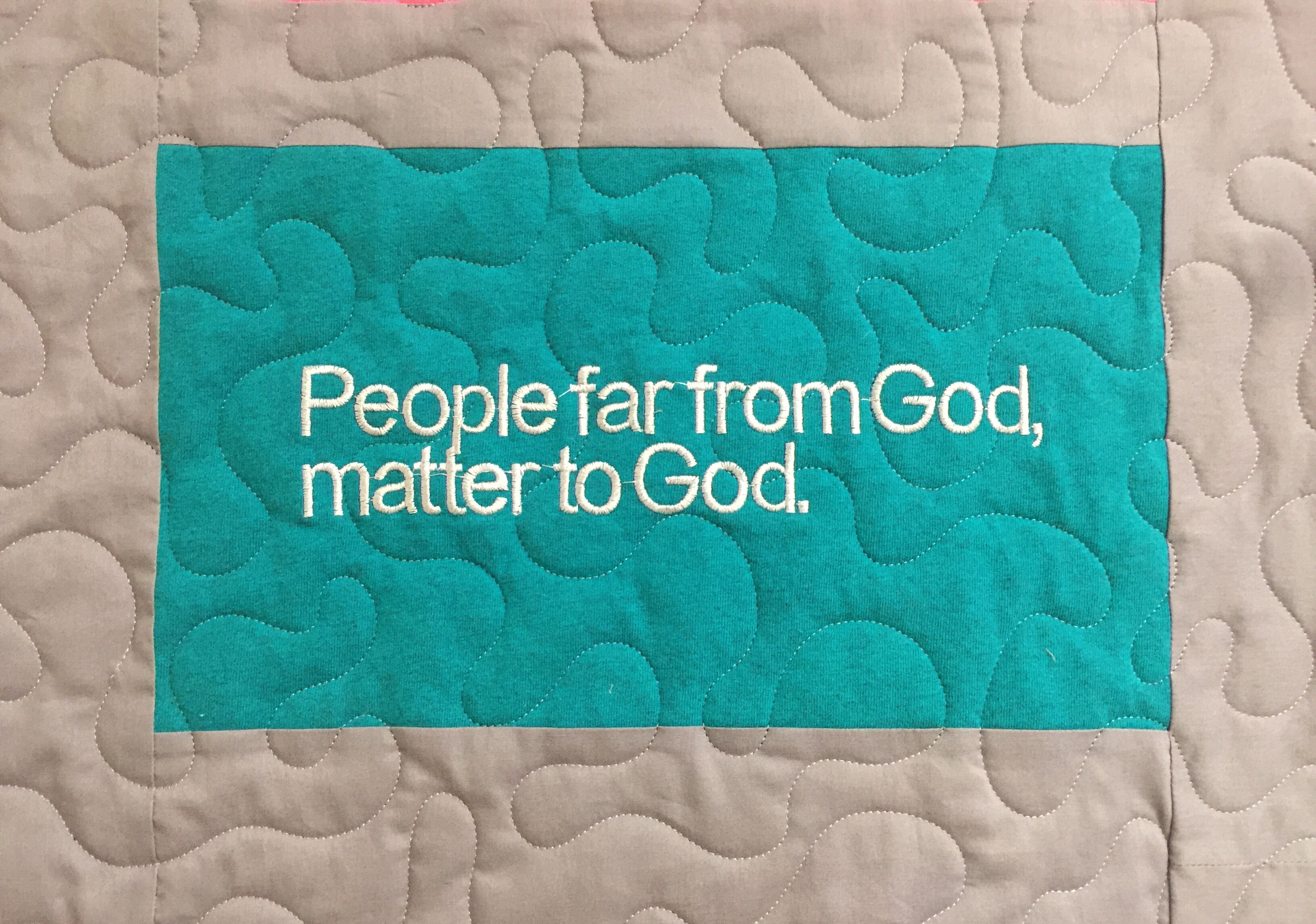 I decided to embroider some of our core values/beliefs on blocks cut from the backs of the shirts as well.
