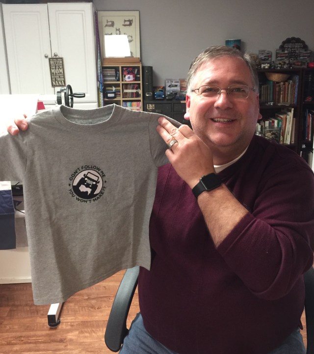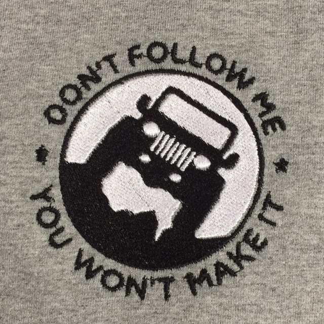 He’s working on Jeep shirts for our grandsons. They all like Nana’s Jeep! Mr. found this graphic online, digitized it, and stitched it up!