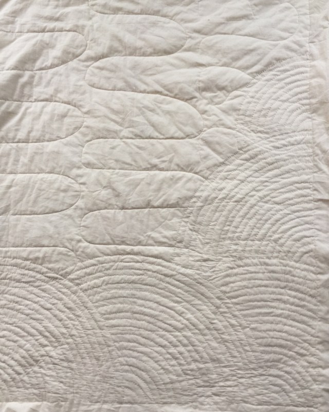 As you can see, I’m doing just the opposite. Traditionally, Baptist Fans were quilted from the outside in at a large floor type of quilting frame. The fans were not marked, but each one built upon the last freehand. I’m using a stencil, but wanted to let my fan placement occur organically as it would if I used a large frame. I’ve basted well and I think it will work out fine.