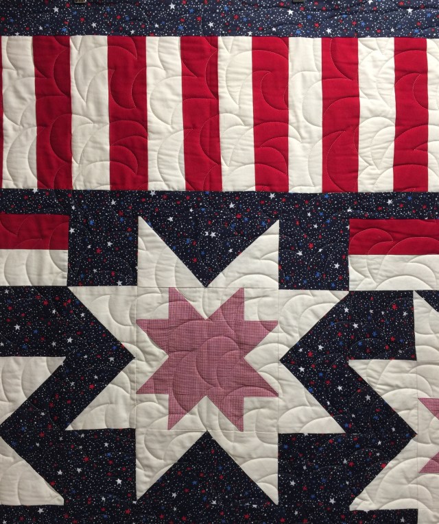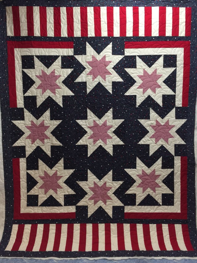 I had such a great time at the National QOV Sew Day with my Stitching Sisters! I brought back four tops to quilt this month. The first top was pieced by Rosa.