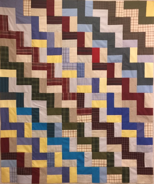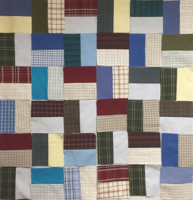 Here s the first of three quilts I am making from men’s shirts. My first thought was to randomly piece and place these into a fence rail setting.