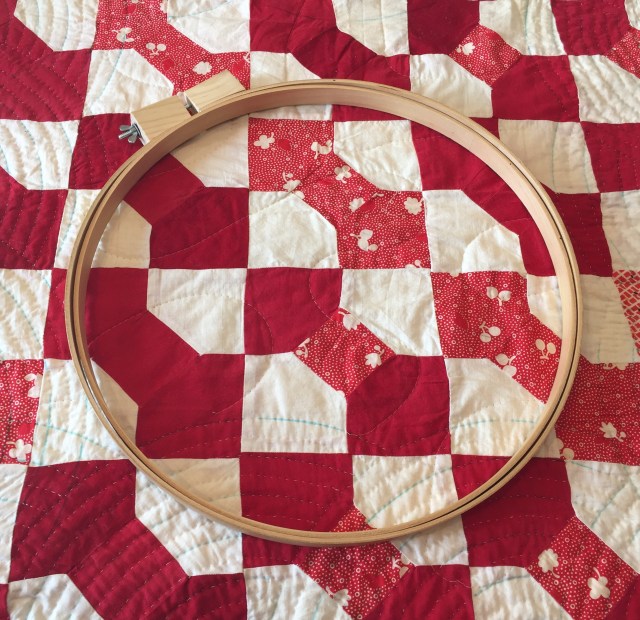 It is only about 29 inches square and far from perfectly pieced! I wanted to use this smaller hoop in the truck.