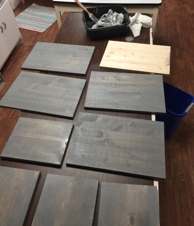 Our first craft night was a great success! Not everyone finished, but we all had loads of fun. And we will get together again to finish. Here is a quick tutorial on string art for a crowd. First I cut and stained the boards ahead of time.