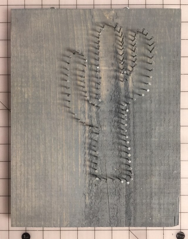 Next I taped a simple line drawing to the front of my board and pounded nails in along the lines. 3/4 inch bright nails worked well.