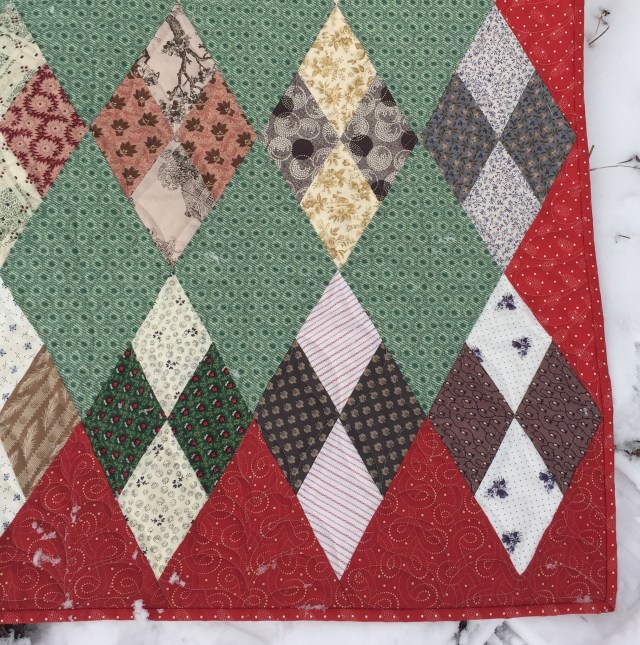 Oooo…love these diamonds! Yes, reds and greens, but this doesn’t scream Christmas at me. It’s a classic and the muslin backing is perfect. Beautiful finish!
