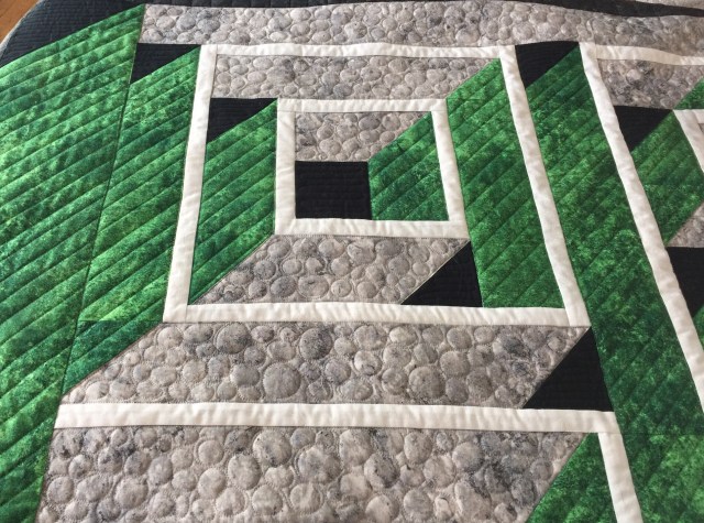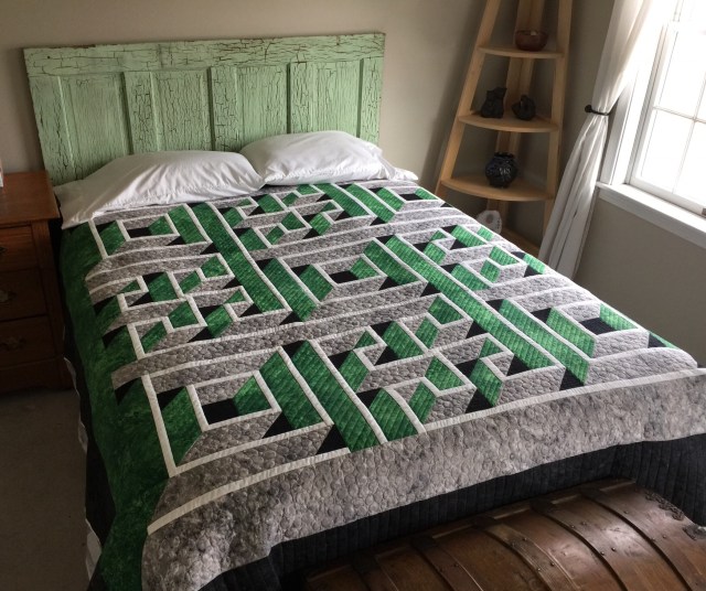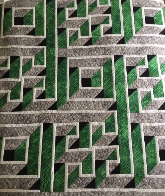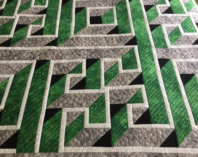 I finished quilting this Labyrinth Walk quilt for my friend, Donna. It’s a big one! I love the colors and fabrics she chose. She wanted a custom job that would emphasize the 3D design.