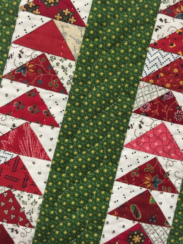I kept the quilting simple with just straight lines through the geese. I do love the rope pattern in the green strips