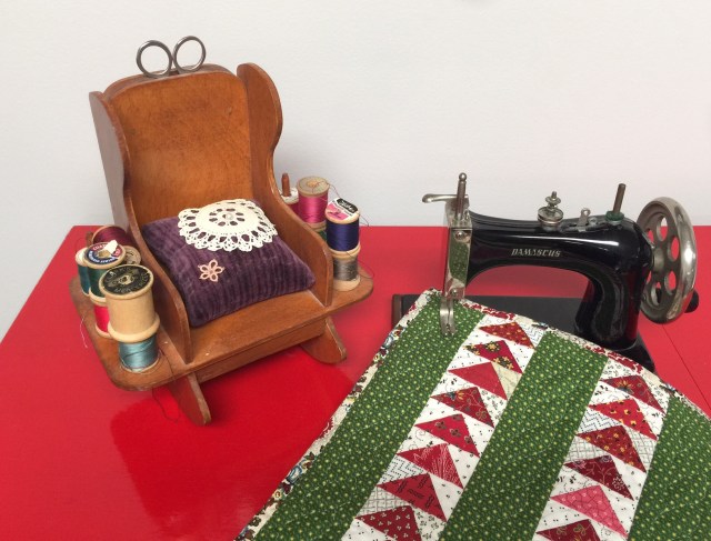 The last photo REALLY shows off the wonderful quilting on this charming little quilt. I have (or at least USED to have) a little chair identical to yours. My father-in-law made it for me decades ago though I don’t believe it had the slot on top for scissors. I just love your tiny quilts. Keep them coming!