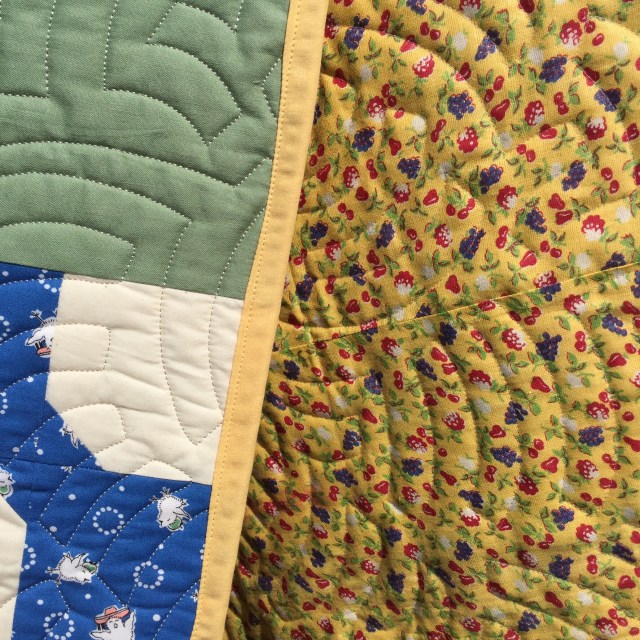The muted colors of the front are so perfect for a baby quilt. I really like that happy yellow on the back and binding. Are you switching to machine binding more now due to your carpal tunnel?
