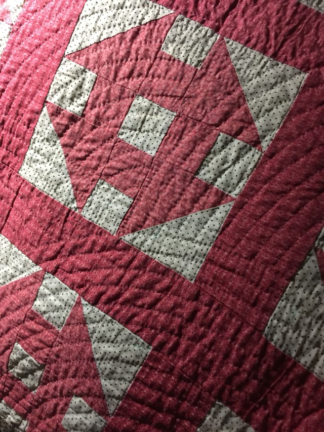 It’s done! Remember the sad quilt that hubby bought me for my birthday? I took it apart and it has been requilted and bound. Here are a couple before shots to refresh your memory.