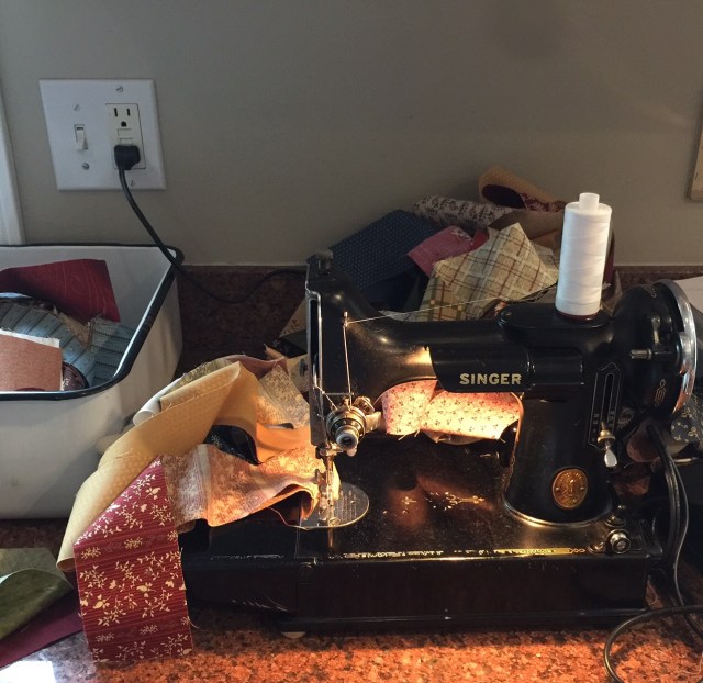 I set up at the kitchen counter to sew the ends of my strips together because I was waiting for a package that I had to sign for.