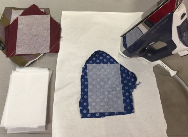 I cut pieces of fusible interfacing a big larger than my pieces.