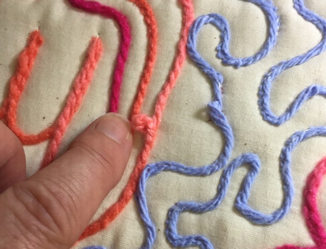 Like most things, it isn’t quite as easy as it looks on YouTube! But the videos are helpful. The couching feet have a hole in the center just big enough for the yarn and thread to go through. As you stitch, the thread stitches the yarn to the surface of the quilt. Sometimes it moves too fast and the yarn didn’t get stitched down.