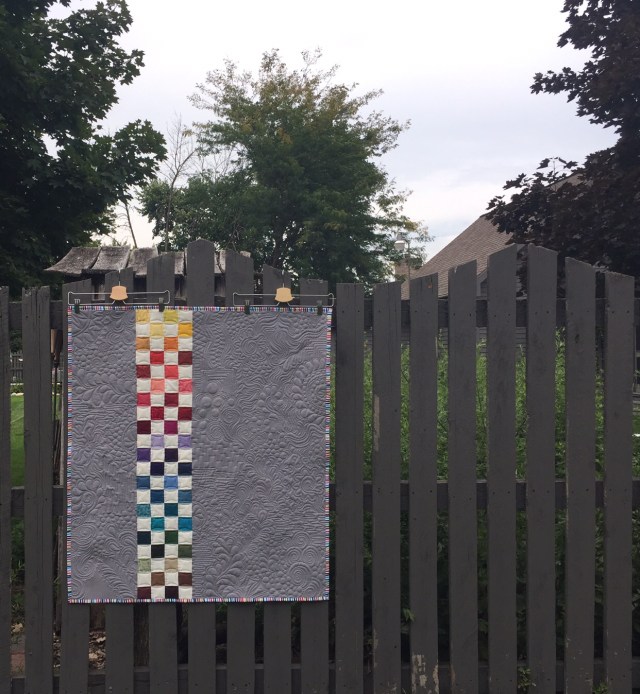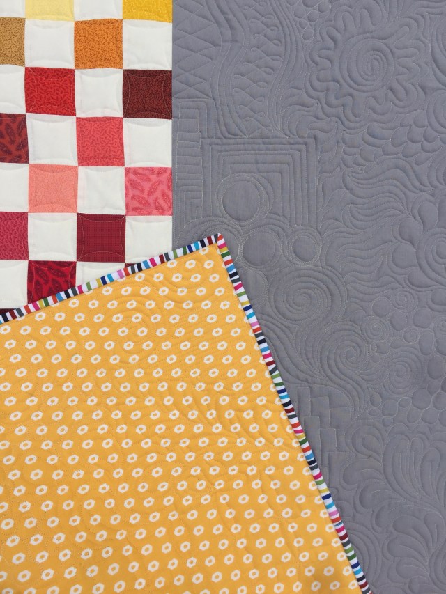 Oh I don’t think I could part with this one either! I love the front with the colorful strip and all the quilting. When you showed the backing, I fell completely in love with it. You can send it to me when you’re tired of it. Hahaha! Nice finish, Katy!