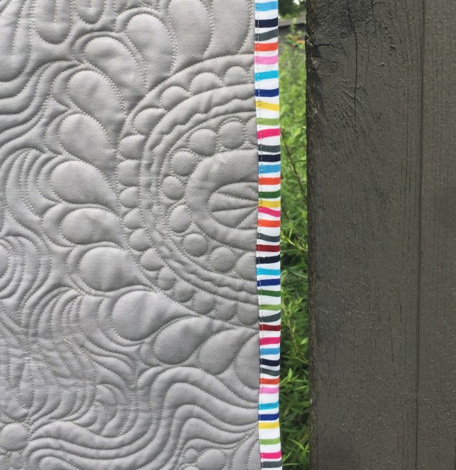 Wasn’t too sure about plain gray on a baby quilt but filling it with so many different quilting motifs changes everything. I can imagine a fascinated toddler tracing along all the pathways.