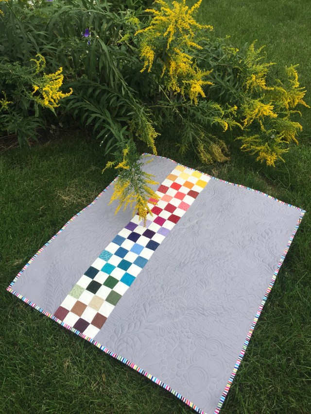 Squares in a rainbow of colors, striped binding, and that fun quilting? Sounds like a recipe for the perfect quilt!!!
