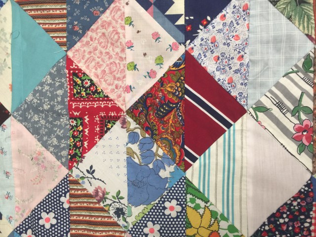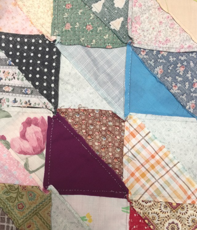 I’m guessing this dates to the early 1980s, but it does contain some fabrics that date back as far as the 50s. Most are probably from the 60-70s. The blue floral edge piece in the next photo is just like a blouse I wore as a freshman in high school which was 1979.
