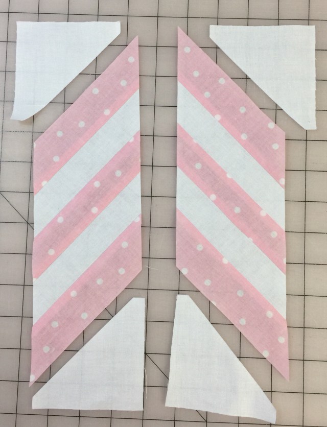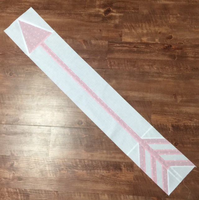 Given all of that, I had to make an arrow quilt for this little one. I didn’t have a pattern so I’m making it up as I go. Here’s the start. I strip pieced the pink and white strips (they are cut 1 1/2 inches wide), then folded the strip set in half, right sides facing. Then when I cut the 45 degree angles, I had two pieces in mirror image.