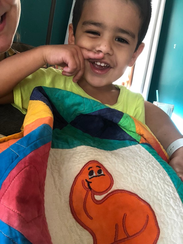 Here is E2 with the dinosaur quilt that I made for him before he was born. It’s nice that he still loves it. It makes this Nana’s heart swell!