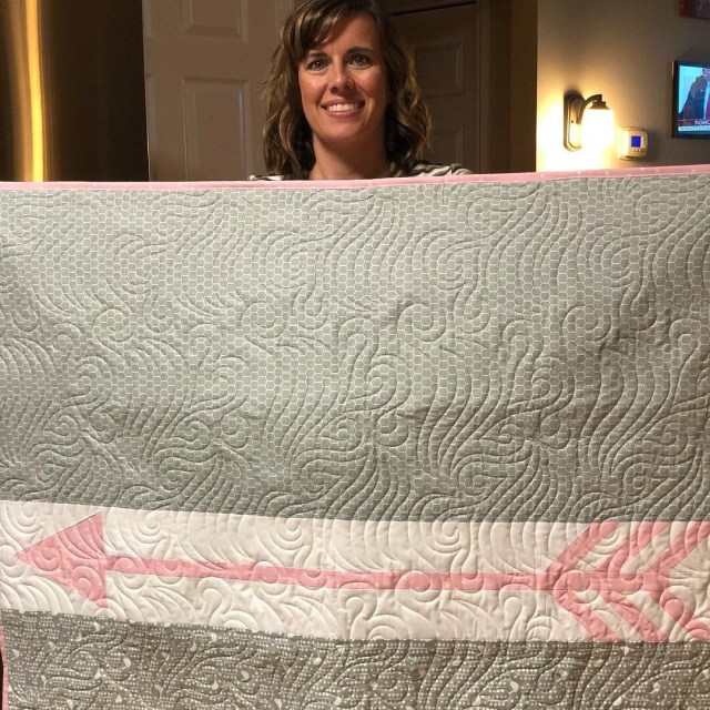 Beautiful!! I love the simplicity of the quilt design, and the combination of pink and grey is perfect. Oh and…the quilting…love it!