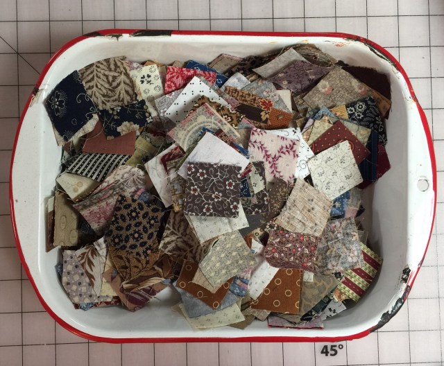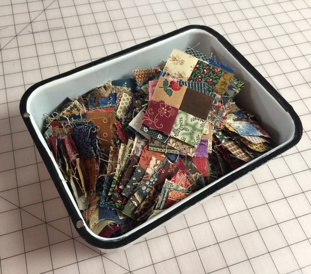 I really need to sew mine into 4 patches, then it would look like I am making progress. Sometimes I will put on a record to listen to and just cut up the remnant bin of scraps.