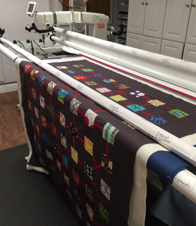 This is how the backing turned out. All the solids in this quilt are Kona Cotton. It really is my favorite solid. They have a great selection at the Fat Quarter Shop and the price is better than my local JoAnn’s.