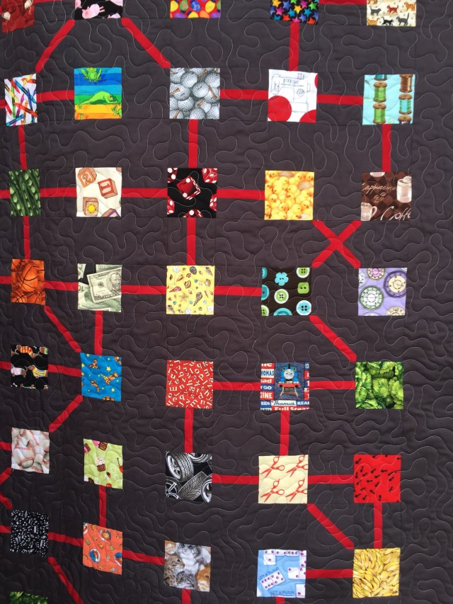 What a fun design! Are the red lines appliqued? (I know, I can look it up…) And the panels on the back are perfect!